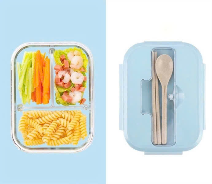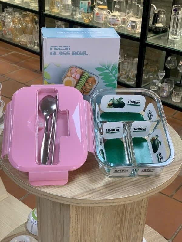 Hộp cơm thủy tinh 3 ngăn 1040ml kèm thìa đũa Tmark (Kiện 24 cái)