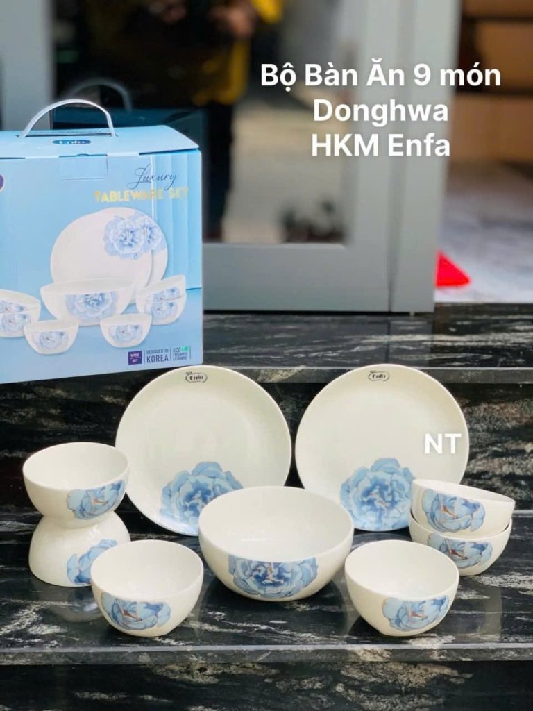 Bộ bàn ăn tô chén dĩa sứ cao cấp hoa xanh 9 món Tmark HKM Enfa (Kiện 8 bộ) (Hàng nguyên kiện)