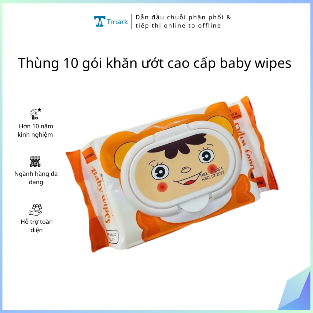 Thùng 10 gói khăn ướt cao cấp baby wipes (Kiện 9 thùng)(Hàng nguyên kiện)